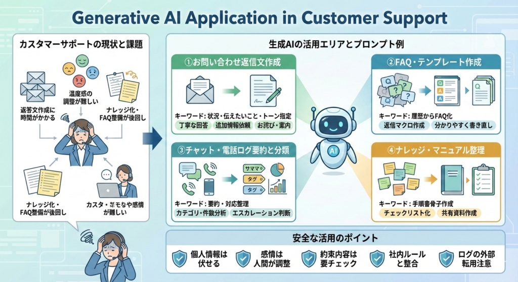 生成AIは、「返信文のたたき台作り」「FAQ・テンプレート作成」「ログ要約」「ナレッジ整理」の相性が非常に良い分野です。