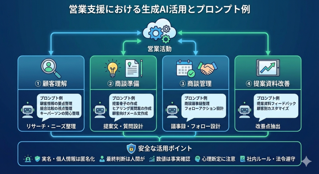 生成AIは顧客理解・資料作成・提案改善を支援し、営業成果につながるアクションを加速させる力を持っています。