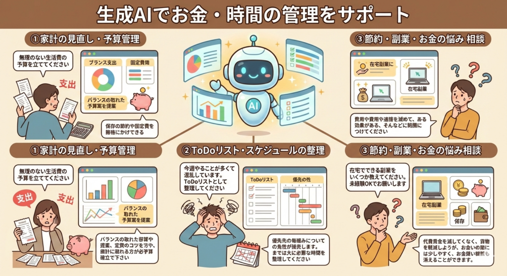 生成AIは、日々のお金の使い方を見直したり、忙しい毎日の予定を整理するサポートにも活用できます。
