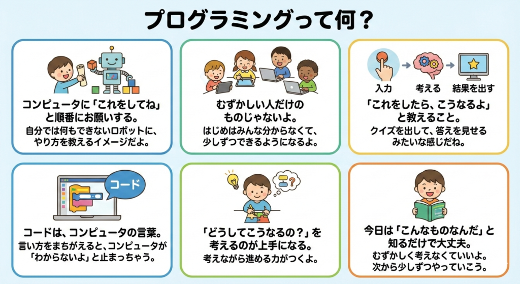 この章では、プログラミングの正体を知ることが目的です。ここで完璧に理解できなくても問題ありません。大切なのは、「なんとなくこういうものなんだ」とイメージを持つことです。次の章からは、もう少し具体的に、何ができるのか、どうやって始めるのかを見ていきます。