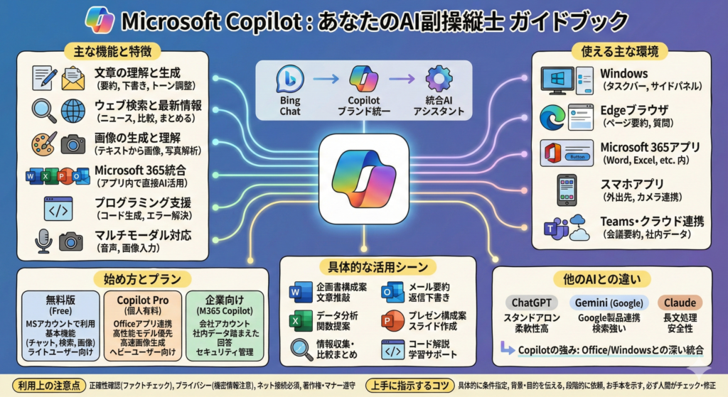 Copilotは、WindowsやMicrosoft 365と深く統合された、マイクロソフト製のAIアシスタントです。文章作成、要約、調査、画像生成、データ分析、プログラミング支援など、多岐にわたる作業を手伝ってくれます。無料版でも十分に強力であり、さらに有料のCopilot Proや企業向けプランを利用すれば、WordやExcel、Outlookなど日々の仕事の中心となるアプリの中にAIを組み込むことができます。