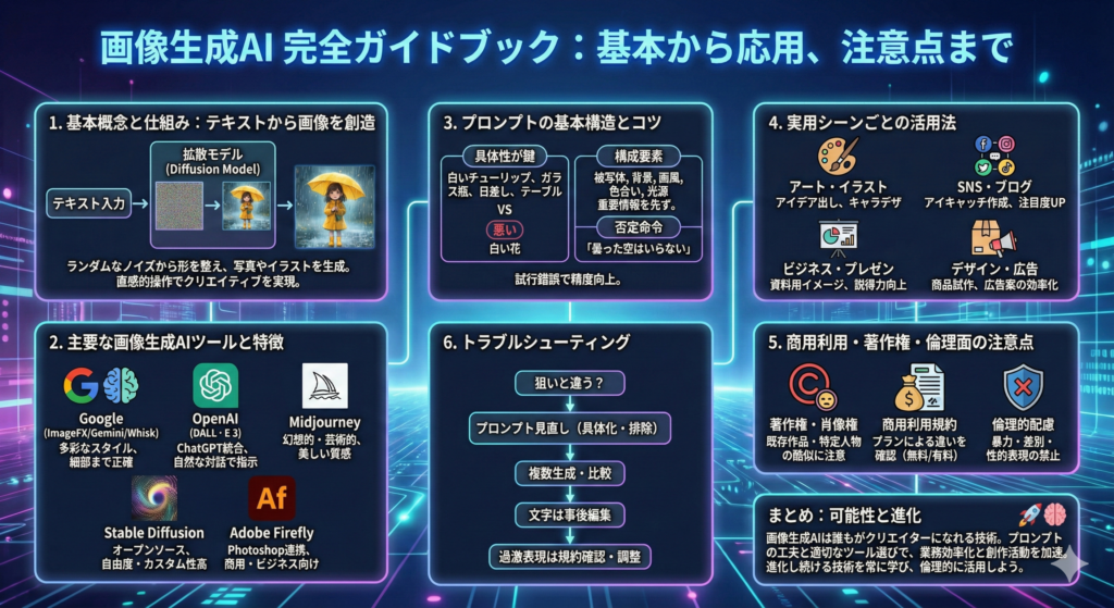 画像生成AIは、誰でも手軽に高品質な画像を作れる技術であり、創作活動の幅を大きく広げます。プロンプトの工夫とツール選びを行うことで、業務効率化にも強い効果を発揮します。進化のスピードが速い分、常に新しい情報に触れながら活用していくことが、より良い成果につながります。