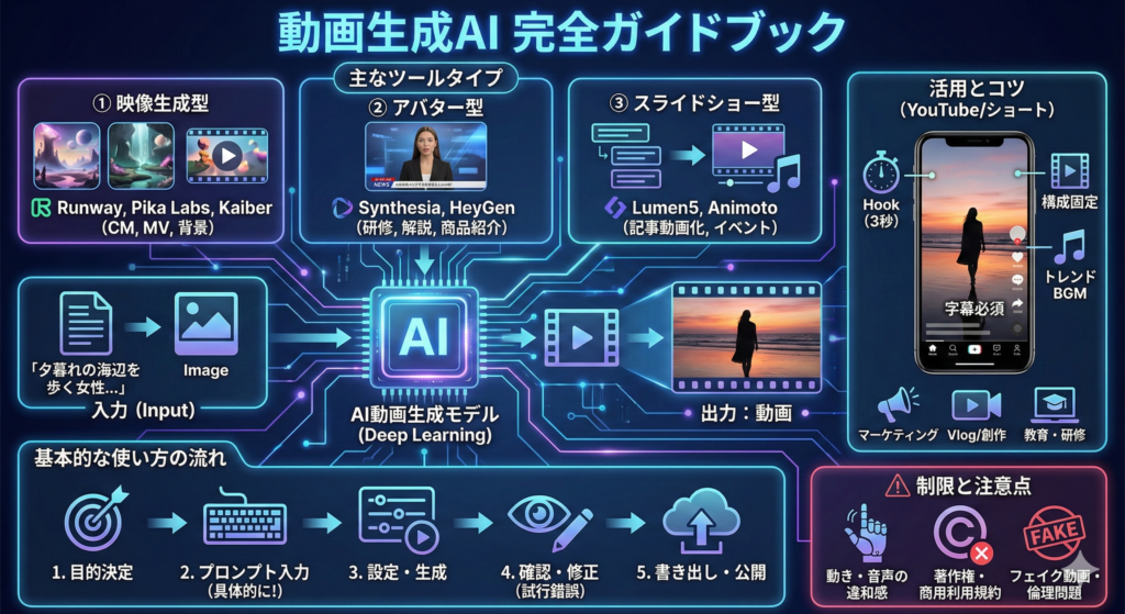動画生成AIツールはたくさんありますが、基本的な流れはどれも似ています。まず、自分が作りたい動画の種類を決めます。背景映像のようなシーンを作りたいのか、アバターに喋ってもらう解説動画を作りたいのか、記事をスライド風に動画化したいのかを最初に決めておくと、ツール選びもスムーズです。