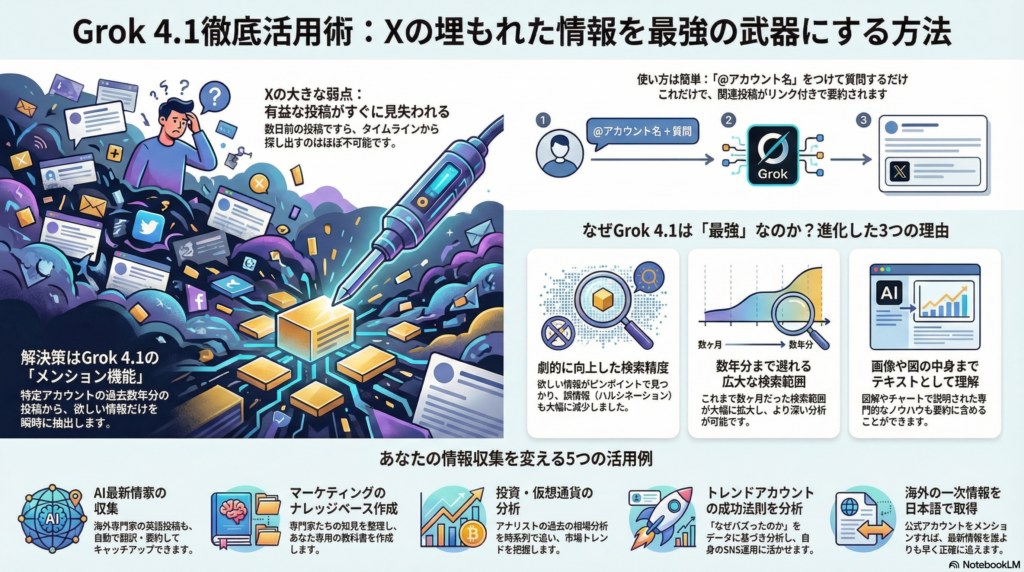 今回は、X(旧Twitter)上の膨大な投稿の中から自分が必要な情報だけを効率的に取り出すことができる、最新のAIツール「Grok 4.1」の活用方法について解説します。日々流れていく情報の中から、過去の有益な投稿を数秒で見つけ出し、自分専用の知識としてまとめるための具体的な手順やメリットを分かりやすくお伝えします。