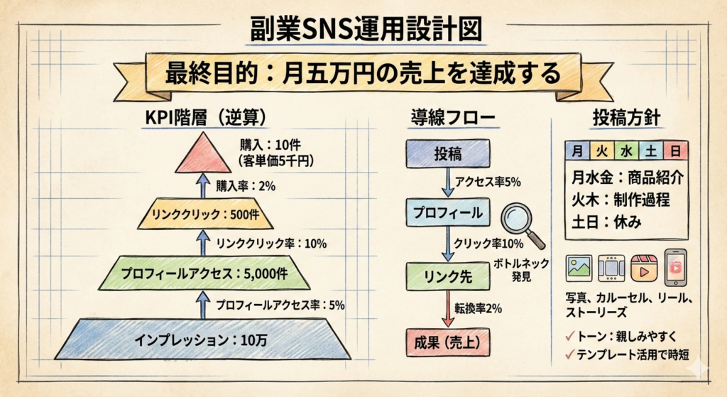 導線フローも図式化します。投稿からプロフィール、プロフィールからリンク先、リンク先から成果までの流れを矢印で結び、各ステップでの転換率も記入します。この図を見れば、どこがボトルネックになっているかが一目瞭然です。