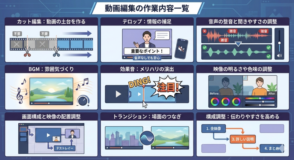 今回は、動画編集で実際に行われている作業内容を解説します。テロップやカットといった基本的な作業だけでなく、動画の印象や完成度を高めるために行われる細かな工程についても触れていきます。動画編集を依頼する側の方にも、これから編集を学びたい方にも役立つ内容を目指しています。